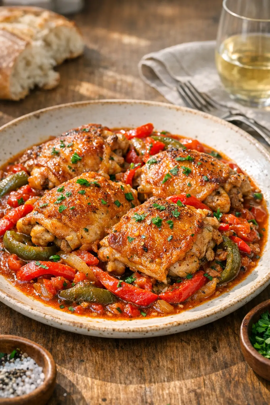 - Faster weeknight version: Use boneless, skinless chicken thighs (1 1/2 lb / 680 g) cut into large chunks. Brown briefly, then simmer covered for 12–15 minutes. You’ll trade crispy skin for shorter cook time, but keep all the pepper-sweet sauce.