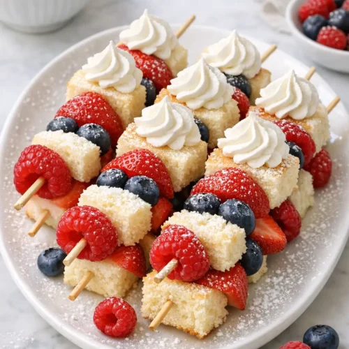 You can prep the components a day ahead—wash and dry the berries, cut the cake, and whip the cream (stabilized if possible). Store the berries and cake separately in airtight containers in the fridge. For the nicest texture, thread the skewers within a few hours of serving so the cake doesn’t absorb too much moisture.