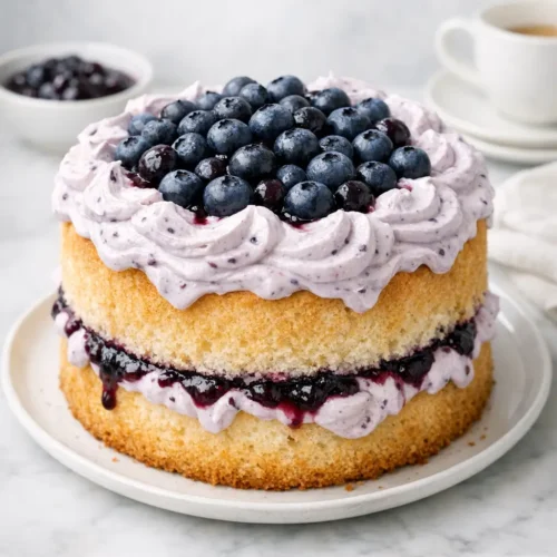 The base recipe is already vegetarian. For a dairy-free, egg-free version, you’d need to move away from a classic chiffon and use a sponge-style vegan batter with aquafaba meringue and plant-based cream. The texture will be denser and less springy, but you can still layer it with blueberry compote and coconut or oat-based whipped topping.