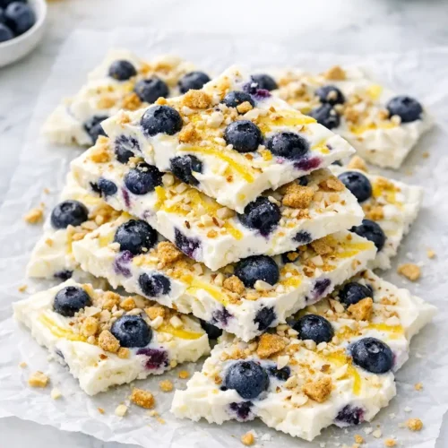Blueberry lemon yogurt bark is one of those snacks that feels like dessert but behaves more like a high‑protein yogurt bowl straight from your freezer. It’s cool, tangy, lightly sweet, and full of juicy blueberry pockets with bright lemon running through each bite.