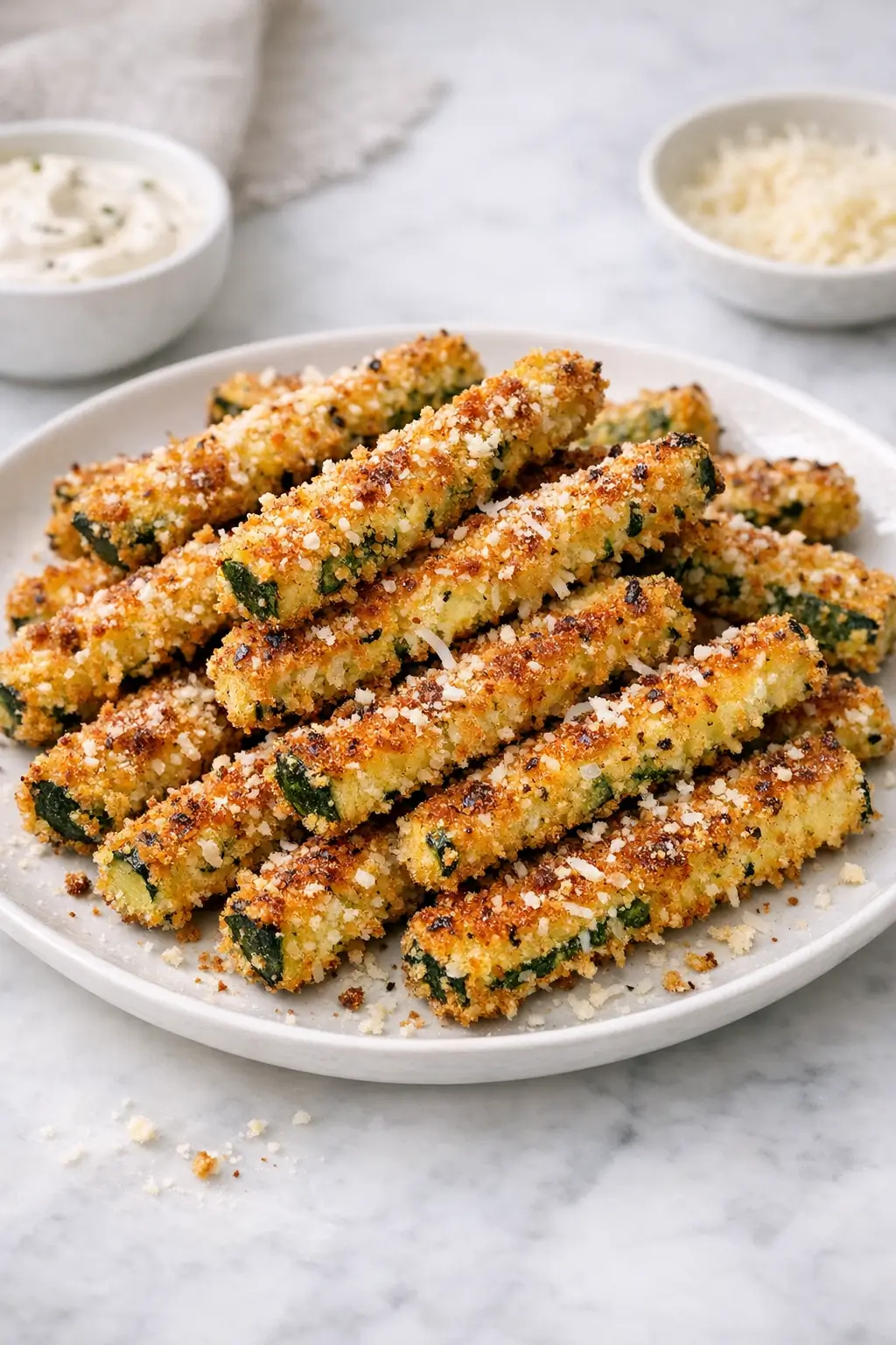 Lighter, no-breading option. Skip the flour, egg, and panko entirely. Toss the zucchini sticks in a tablespoon of olive oil, salt, pepper, garlic powder, and a generous handful of Parmesan. Air fry as directed, then shower with more cheese at the end. You won’t get the same thick crust, but you do get browned, cheesy edges and far less mess.