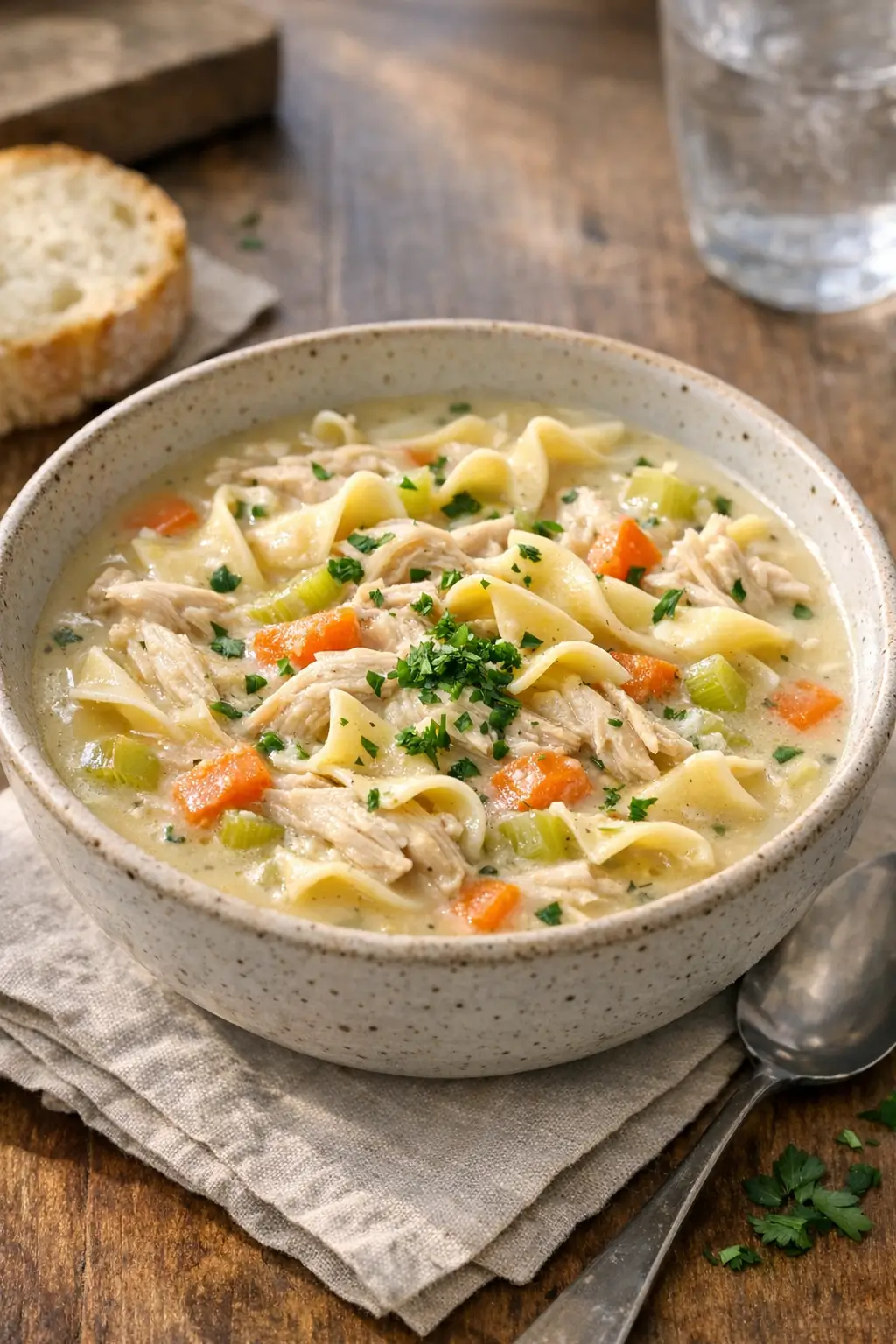 A bowl of easy creamy chicken noodle soup is weeknight comfort without the fuss. You get the familiar savory broth, tender chicken, and soft noodles, finished with a gentle creaminess that doesn’t feel heavy. Expect a calm, soothing flavor profile with carrots, celery, and thyme doing quiet work in the background.