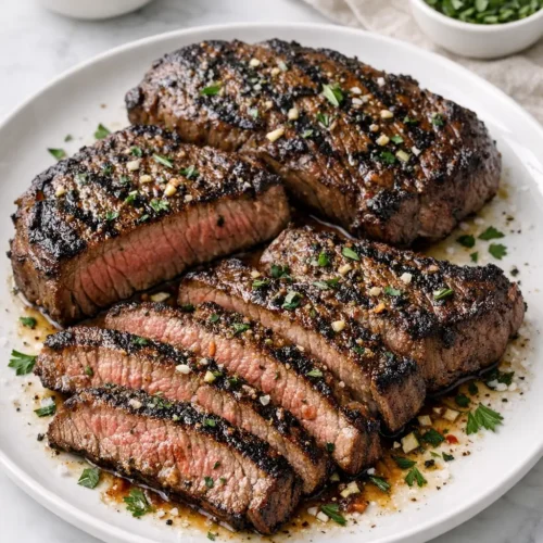 For strip, ribeye, or sirloin, you can serve steaks whole. For flank or other long‑grain cuts, slice thinly across the grain at a slight angle. Sprinkle with a pinch of flaky sea salt and a little extra chopped parsley or rosemary right before serving, if you like.