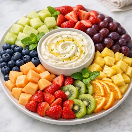 A fresh fruit platter with honey lime dip is an adaptable option for busy home kitchens: it scales up or down easily, uses everyday ingredients, and still feels special on the table.