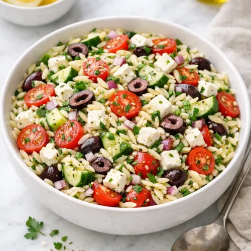 This salad leans on classic Greek salad flavors—cucumber, tomato, red onion, olives, oregano, and feta—folded through small, tender orzo. It works well as a light main at lunch, a side for grilled meat or fish, or part of a mezze-style spread any time of year.