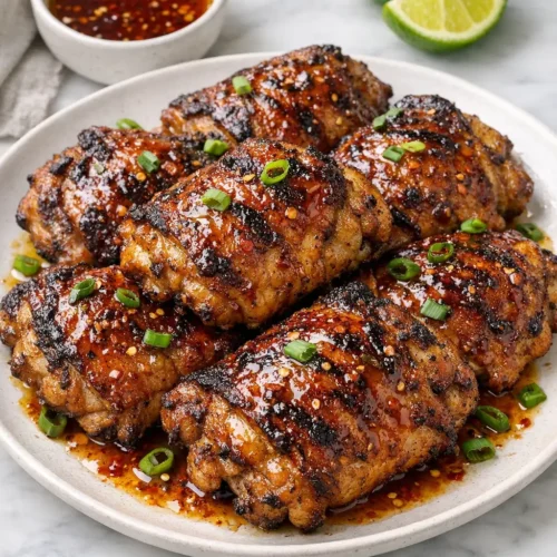 These grilled chicken thighs with hot honey glaze work well as a main dish for casual dinners, backyard cookouts, or weekend meal prep.