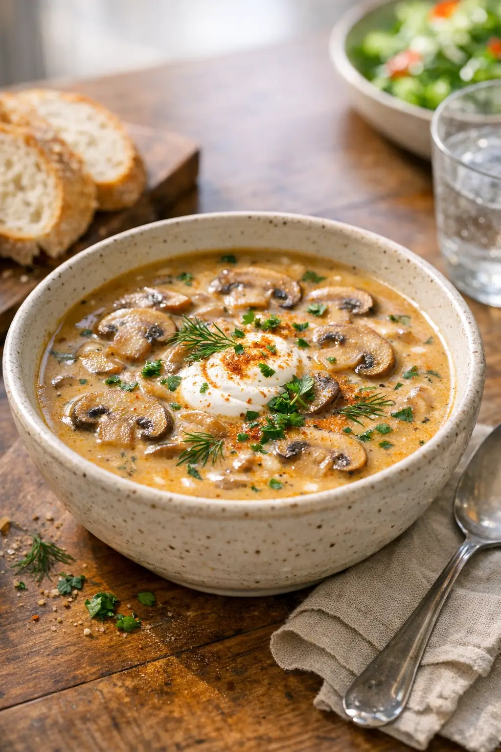 Texture: This is a spoon‑coating, lightly creamy soup—not a heavy puree. You’ll see tender mushroom slices suspended in a glossy broth.