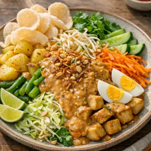 Store components separately for best texture. The peanut sauce keeps 4–5 days in an airtight jar in the refrigerator; thin with warm water and re‑season with lime before serving. Blanched vegetables keep 2–3 days; pat them dry before chilling to avoid waterlogging. Hard‑boiled eggs (peeled or unpeeled) hold up to 1 week. Fried tofu/tempeh is best day‑of but can be re‑crisped in a skillet with a tiny splash of oil.