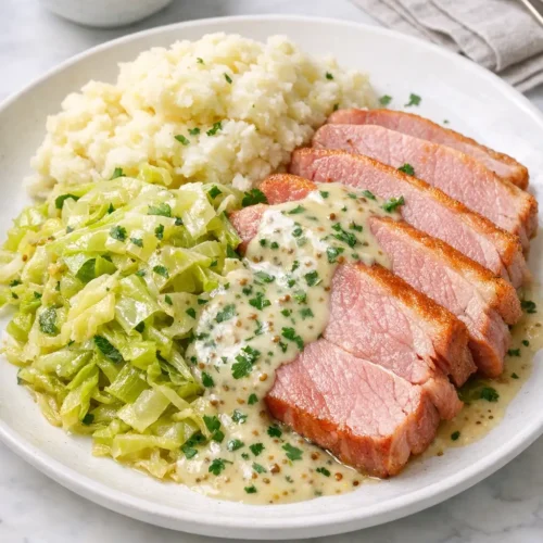This dish shows up often in Irish home cooking and on pub-style menus, especially around colder months and St. Patrick’s Day, but it works year-round for anyone who likes comforting, salty pork and soft, buttery vegetables. Expect a simple, honest plate with just enough tangy cream sauce to keep it from feeling heavy.