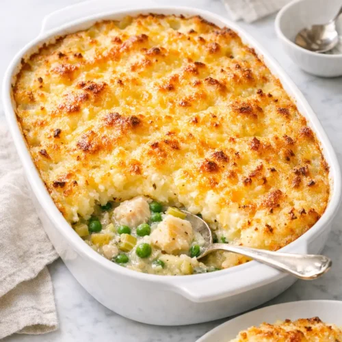 You can expect soft, fluffy potato on top with a lightly crisped cheddar crust and a creamy, spoonable filling underneath. The fish should flake easily into big, moist pieces rather than disappearing into the sauce.