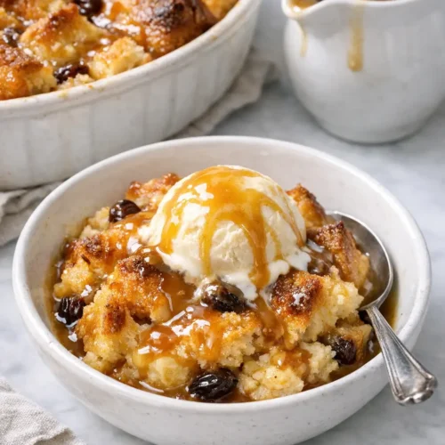 Irish whiskey butterscotch bread pudding is a straightforward dessert that rewards a few simple steps—drying the bread, giving the custard time to soak in, and simmering the sauce gently—with a cozy, shareable pan of comfort.