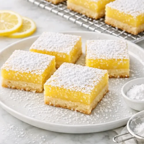 For neat presentation at gatherings, arrange the bars in a single layer on a platter, leaving a bit of space between each piece so the powdered sugar stays visible. A few thin lemon slices or curls of zest scattered around the platter underline the lemon theme.