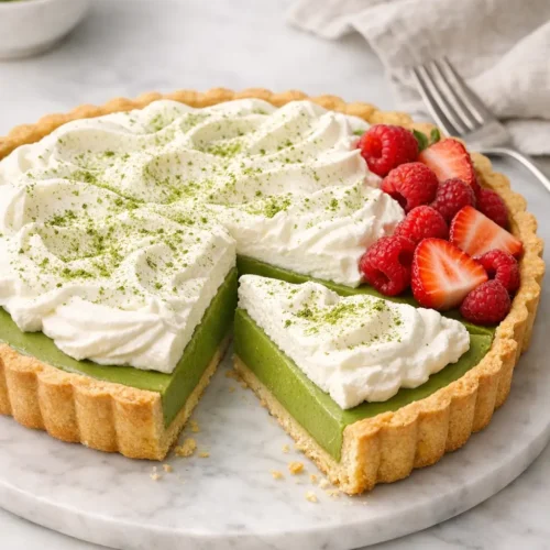 A matcha crème tart looks impressive, but at its core it’s a simple combination of crisp pastry, silky matcha custard, and softly whipped cream. The flavor leans gently earthy and just sweet enough, which makes it a good option when you want dessert that doesn’t feel heavy.