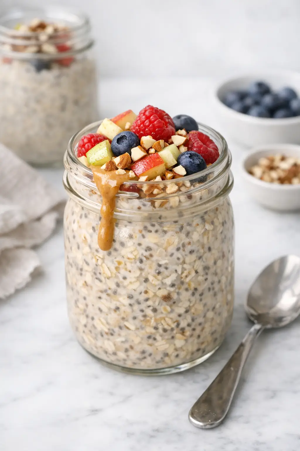 - Add toppings and serve: top with fruit, nut butter, and/or nuts/seeds (add crunchy toppings in the morning so they stay crisp).