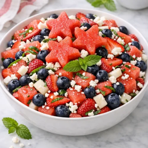 This patriotic watermelon fruit salad with mint is designed for real-life summer cooking: simple knife work, a quick dressing, and ingredients you can find easily at most supermarkets. It’s flexible enough to sit beside grilled favorites or to stand in as a light, fresh dessert.