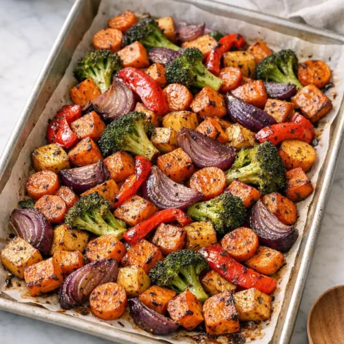 Cut firmer vegetables like carrots and sweet potatoes into smaller pieces and softer ones like peppers and onions slightly larger. If your oven heats unevenly, rotate the pan and give everything a stir halfway through roasting so nothing sits in the hottest spot the whole time.