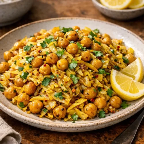A skillet of spiced cabbage and chickpeas brings real weeknight relief: warm spices, crisp‑tender shreds of cabbage, and nutty chickpeas that soak up flavor fast. This Spiced Chickpea and Cabbage Stir-Fry is common in home kitchens where quick, dry-style vegetable sautés are the norm, and it works year‑round as a meatless main or sturdy side.