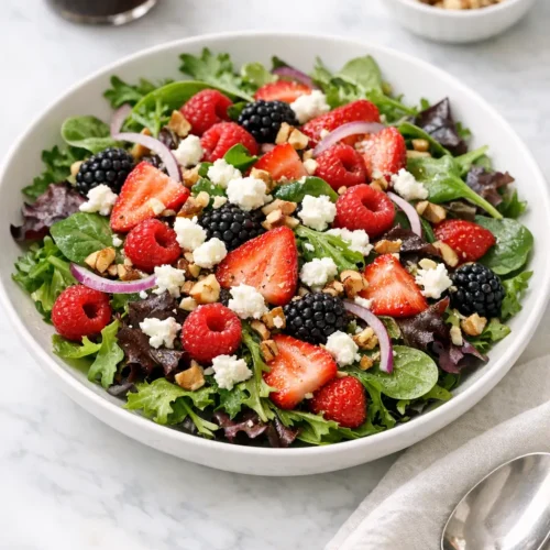 This spring greens salad with goat cheese and berries is designed to be flexible, not fussy. Once you know how the textures and flavors balance—crisp leaves, sweet fruit, tangy cheese, and a bright vinaigrette—you can adjust it to suit what’s in your fridge or who is at the table.