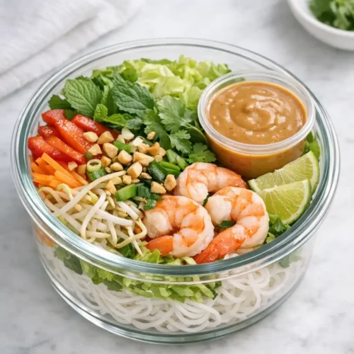 This spring roll bowl with peanut sauce meal prep is essentially a structured salad that leans on noodles and a flavorful dressing to feel satisfying. It fits neatly into a Sunday prep session, rewards a bit of chopping, and then gives you several low-effort lunches.