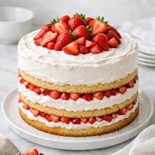 For an even quicker approach, use a reliable vanilla cake mix baked in three 8-inch pans, then follow the same strawberry and whipped cream method here. The texture will be slightly different—more like a traditional birthday cake—but the assembly, chilling, and serving steps all stay the same.