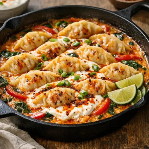 Cook this once and you’ll have a reliable weeknight blueprint: whisk a curry base, bake with frozen dumplings, finish with cool‑creamy yogurt and warm chile butter. Share in the comments how spicy you made yours, what dumplings you used, and any clever swaps that worked in your kitchen. Your notes help the next cook get dinner on the table, too.